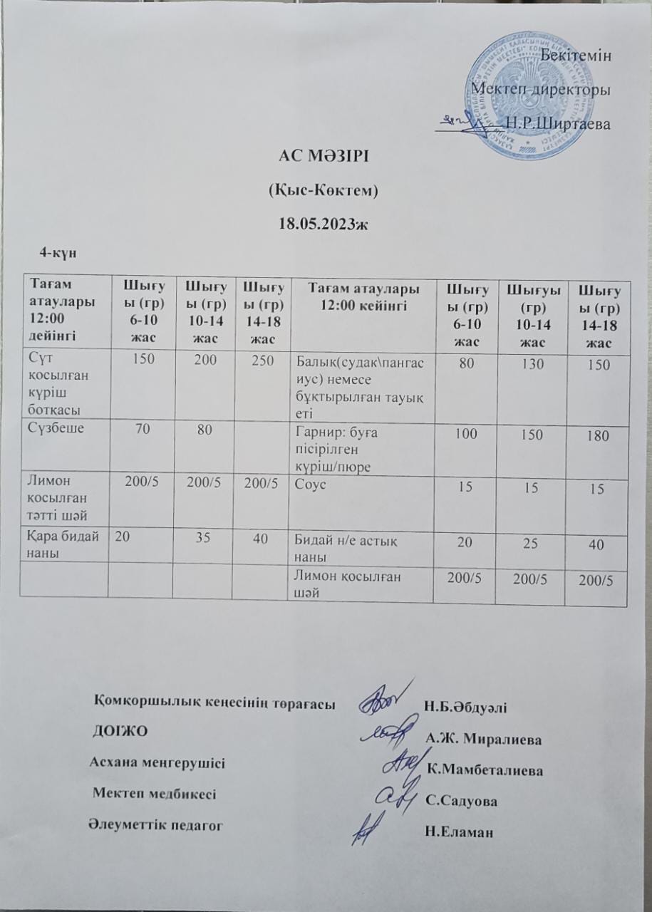 Құрметті ата-аналар 2023 жылғы 18 мамырдағы ас мәзірі, мектебімізде жалпы 1341 оқушы ыстық тамақпен қамтылған. Сіздерге қол жетімді болу үшін "Күнделік" электронды журналдың Mektepmenu бөліміне күнделікті ас мәзірін суретімен жүктеп, салып қойдық. Одан бөлек мектептің әлеуметтік желілеріне жүктелуде.