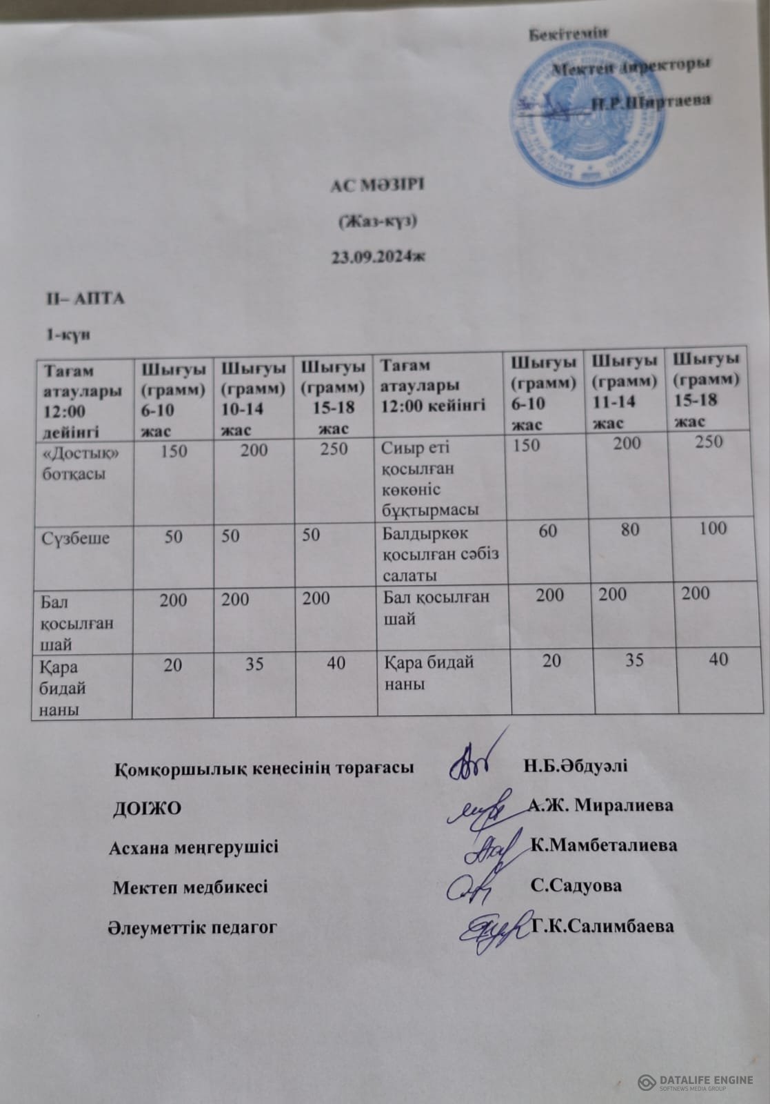 Асхана жұмысы мен күнделікті тамақтың сапасын және ас мәзірінмен сәйкестігін тексеріп , асхана тазалығына бақылау жүргізілуде. Күнделікті дайындалған тағам ас мәзірімен сәйкестендірілген. 2 апталық ас мәзірі бекітіліп , әр сыныптың тамақтану кестесі жасалынды. Тамақтану залында әр сыныптар үшін жеке үстелдер қойылған.