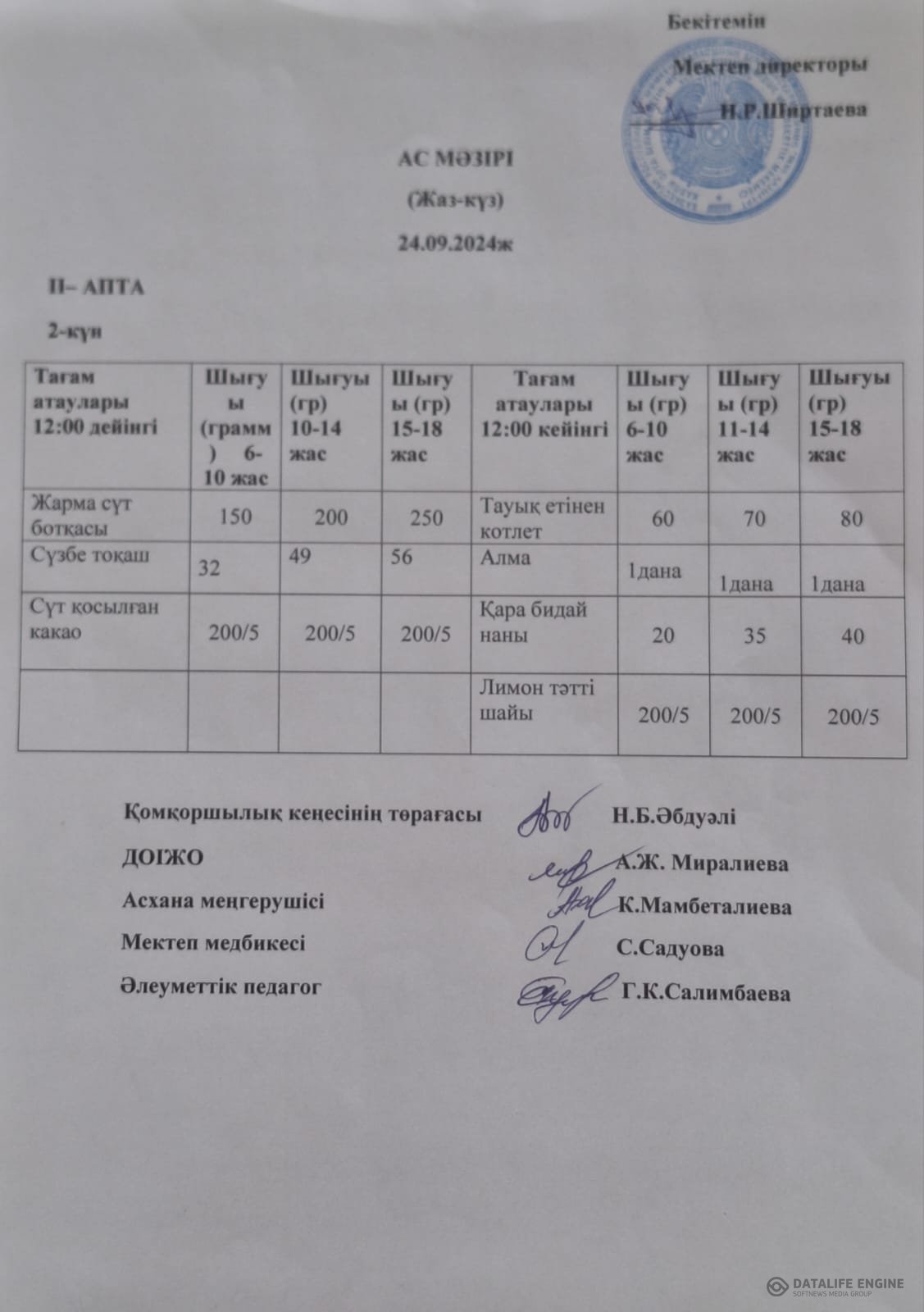 Асхана жұмысы мен күнделікті тамақтың сапасын және ас мәзірінмен сәйкестігін тексеріп , асхана тазалығына бақылау жүргізілуде. Күнделікті дайындалған тағам ас мәзірімен сәйкестендірілген. 2 апталық ас мәзірі бекітіліп , әр сыныптың тамақтану кестесі жасалынды. Тамақтану залында әр сыныптар үшін жеке үстелдер қойылған.