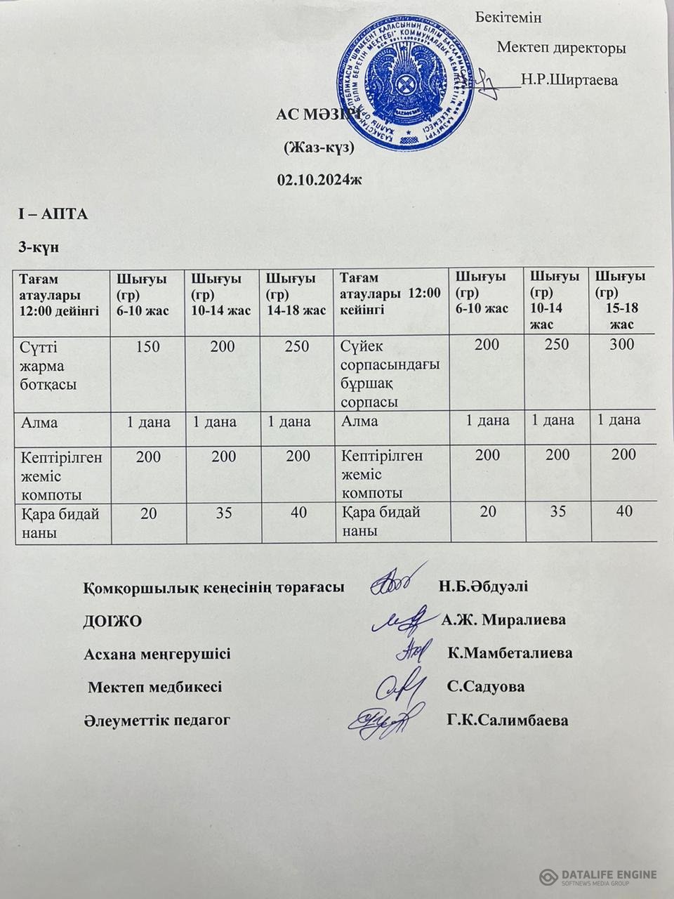 Асхана жұмысы мен күнделікті тамақтың сапасын және ас мәзірінмен сәйкестігін тексеріп , асхана тазалығына бақылау жүргізілуде. Күнделікті дайындалған тағам ас мәзірімен сәйкестендірілген. 2 апталық ас мәзірі бекітіліп , әр сыныптың тамақтану кестесі жасалынды. Тамақтану залында әр сыныптар үшін жеке үстелдер қойылған.