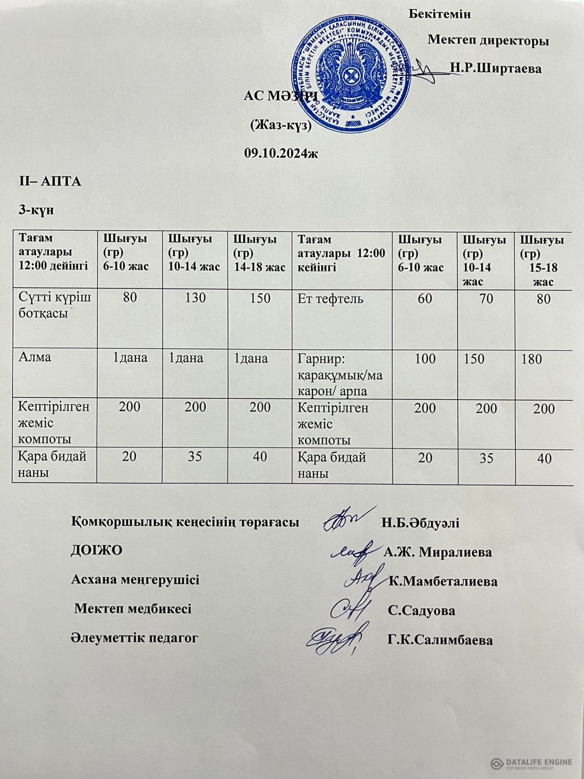 Асхана жұмысы мен күнделікті тамақтың сапасын және ас мәзірінмен сәйкестігін тексеріп , асхана тазалығына бақылау жүргізілуде. Күнделікті дайындалған тағам ас мәзірімен сәйкестендірілген. 2 апталық ас мәзірі бекітіліп , әр сыныптың тамақтану кестесі жасалынды. Тамақтану залында әр сыныптар үшін жеке үстелдер қойылған.