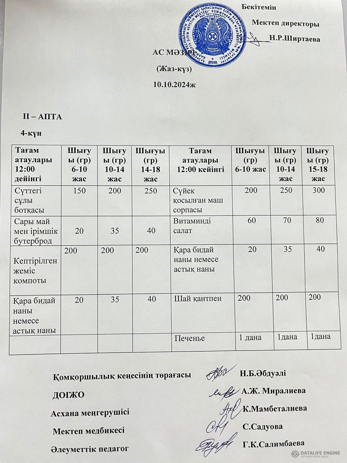 Асхана жұмысы мен күнделікті тамақтың сапасын және ас мәзірінмен сәйкестігін тексеріп , асхана тазалығына бақылау жүргізілуде. Күнделікті дайындалған тағам ас мәзірімен сәйкестендірілген. 2 апталық ас мәзірі бекітіліп , әр сыныптың тамақтану кестесі жасалынды. Тамақтану залында әр сыныптар үшін жеке үстелдер қойылған.
