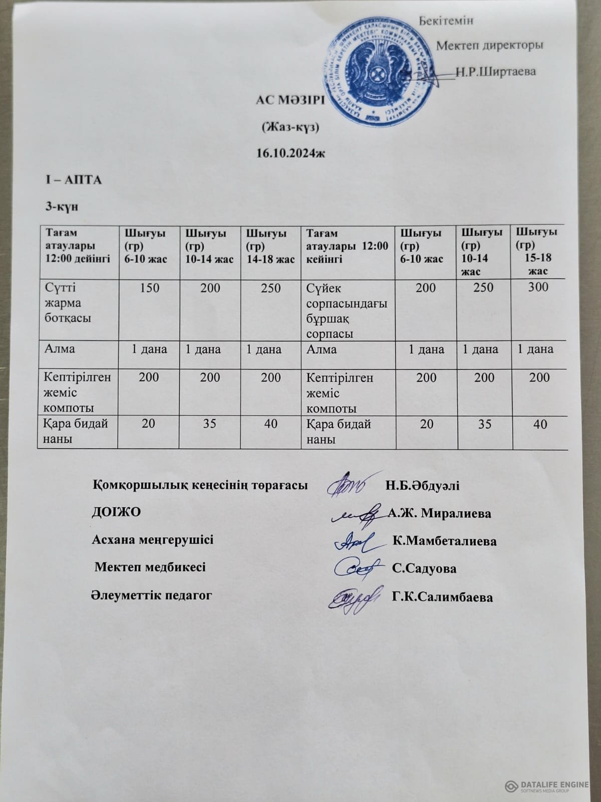 Асхана жұмысы мен күнделікті тамақтың сапасын және ас мәзірінмен сәйкестігін тексеріп , асхана тазалығына бақылау жүргізілуде. Күнделікті дайындалған тағам ас мәзірімен сәйкестендірілген. 2 апталық ас мәзірі бекітіліп , әр сыныптың тамақтану кестесі жасалынды. Тамақтану залында әр сыныптар үшін жеке үстелдер қойылған.