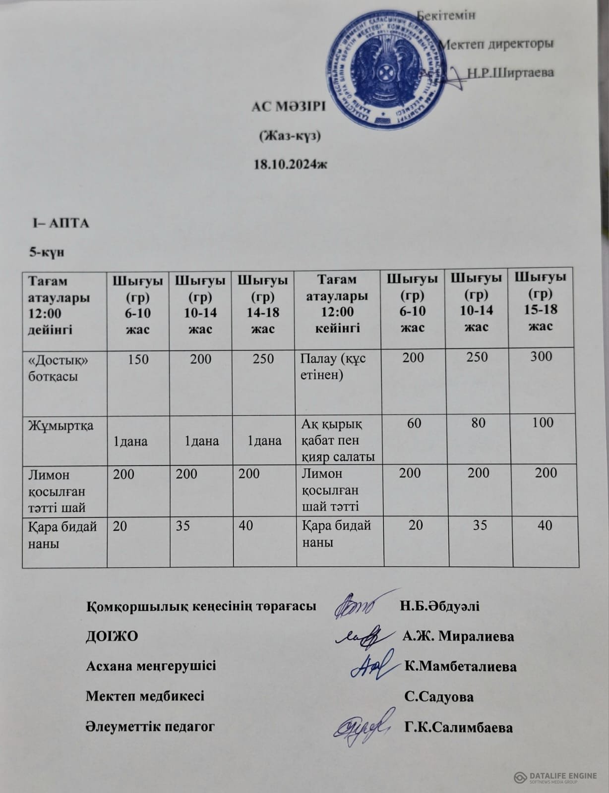 Асхана жұмысы мен күнделікті тамақтың сапасын және ас мәзірінмен сәйкестігін тексеріп , асхана тазалығына бақылау жүргізілуде. Күнделікті дайындалған тағам ас мәзірімен сәйкестендірілген. 2 апталық ас мәзірі бекітіліп , әр сыныптың тамақтану кестесі жасалынды. Тамақтану залында әр сыныптар үшін жеке үстелдер қойылған.