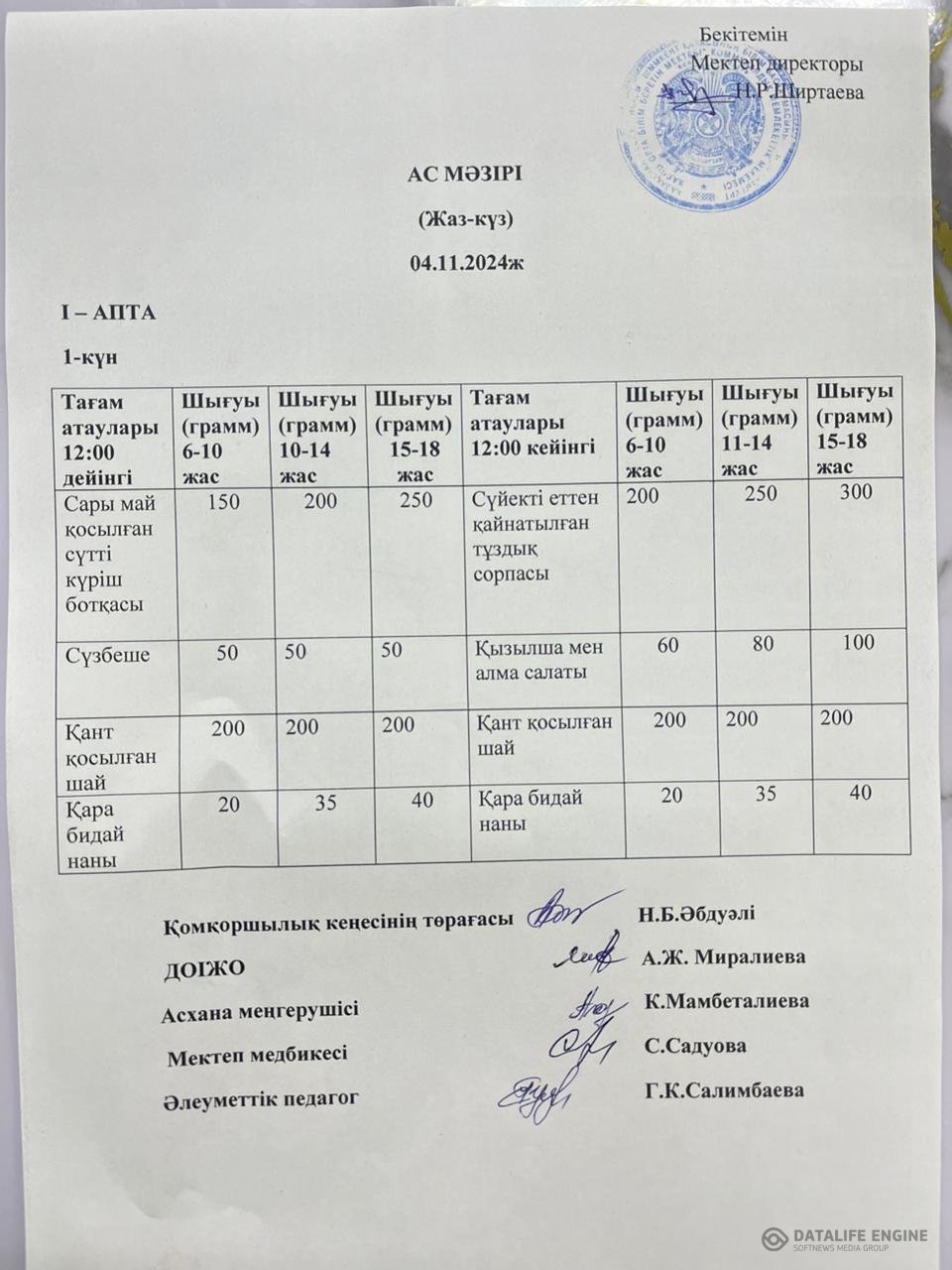 Асхана жұмысы мен күнделікті тамақтың сапасын және ас мәзірінмен сәйкестігін тексеріп , асхана тазалығына бақылау жүргізілуде. Күнделікті дайындалған тағам ас мәзірімен сәйкестендірілген. 2 апталық ас мәзірі бекітіліп , әр сыныптың тамақтану кестесі жасалынды. Тамақтану залында әр сыныптар үшін жеке үстелдер қойылған.