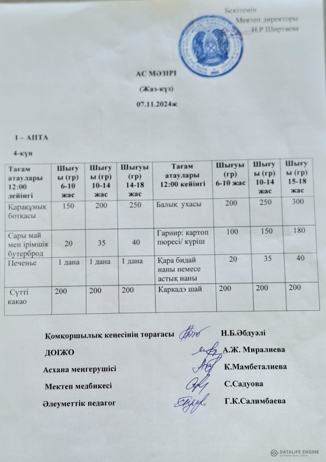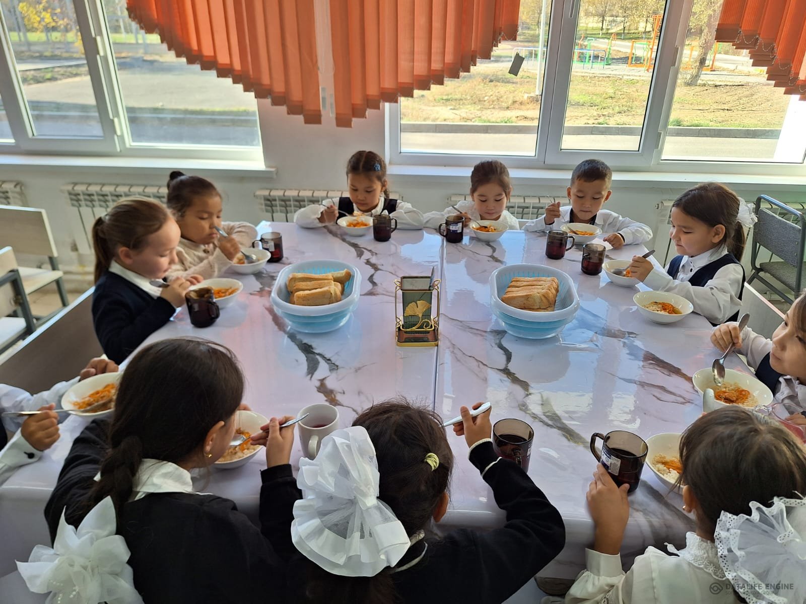 Асхана жұмысы мен күнделікті тамақтың сапасын және ас мәзірінмен сәйкестігін тексеріп , асхана тазалығына бақылау жүргізілуде. Күнделікті дайындалған тағам ас мәзірімен сәйкестендірілген. 2 апталық ас мәзірі бекітіліп , әр сыныптың тамақтану кестесі жасалынды. Тамақтану залында әр сыныптар үшін жеке үстелдер қойылған.