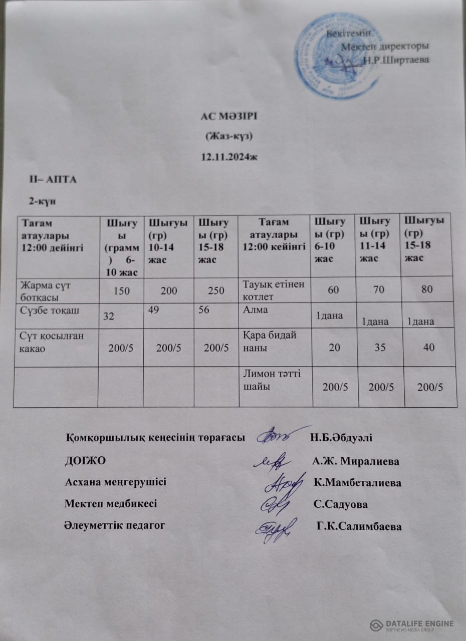 Асхана жұмысы мен күнделікті тамақтың сапасын және ас мәзірінмен сәйкестігін тексеріп , асхана тазалығына бақылау жүргізілуде. Күнделікті дайындалған тағам ас мәзірімен сәйкестендірілген. 2 апталық ас мәзірі бекітіліп , әр сыныптың тамақтану кестесі жасалынды. Тамақтану залында әр сыныптар үшін жеке үстелдер қойылған.