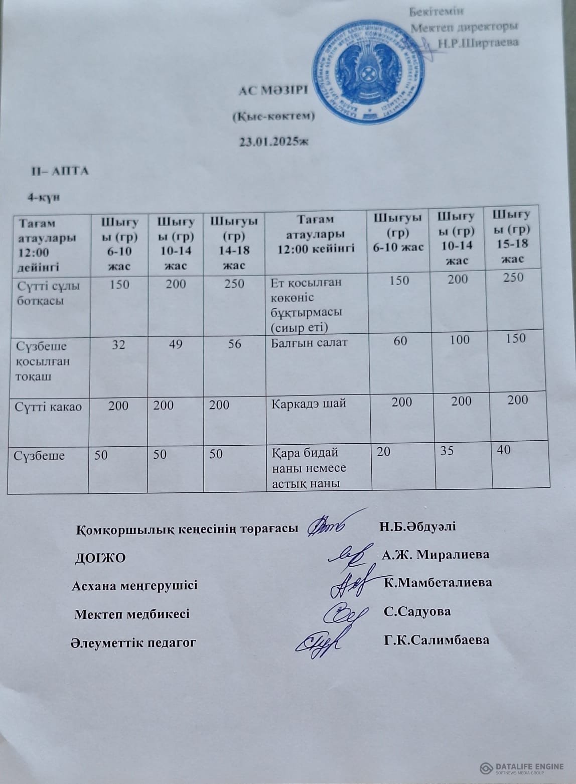 Асхана жұмысы мен күнделікті тамақтың сапасын және ас мәзірінмен сәйкестігін тексеріп , асхана тазалығына бақылау жүргізілуде. Күнделікті дайындалған тағам ас мәзірімен сәйкестендірілген. 2 апталық ас мәзірі бекітіліп , әр сыныптың тамақтану кестесі жасалынды. Тамақтану залында әр сыныптар үшін жеке үстелдер қойылған.