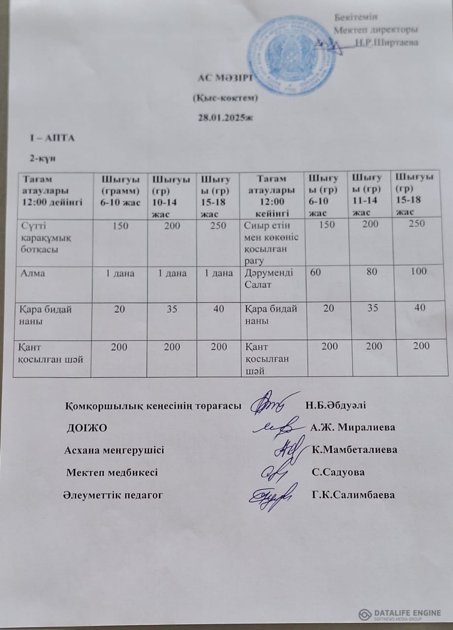 Асхана жұмысы мен күнделікті тамақтың сапасын және ас мәзірінмен сәйкестігін тексеріп , асхана тазалығына бақылау жүргізілуде. Күнделікті дайындалған тағам ас мәзірімен сәйкестендірілген. 2 апталық ас мәзірі бекітіліп , әр сыныптың тамақтану кестесі жасалынды. Тамақтану залында әр сыныптар үшін жеке үстелдер қойылған.