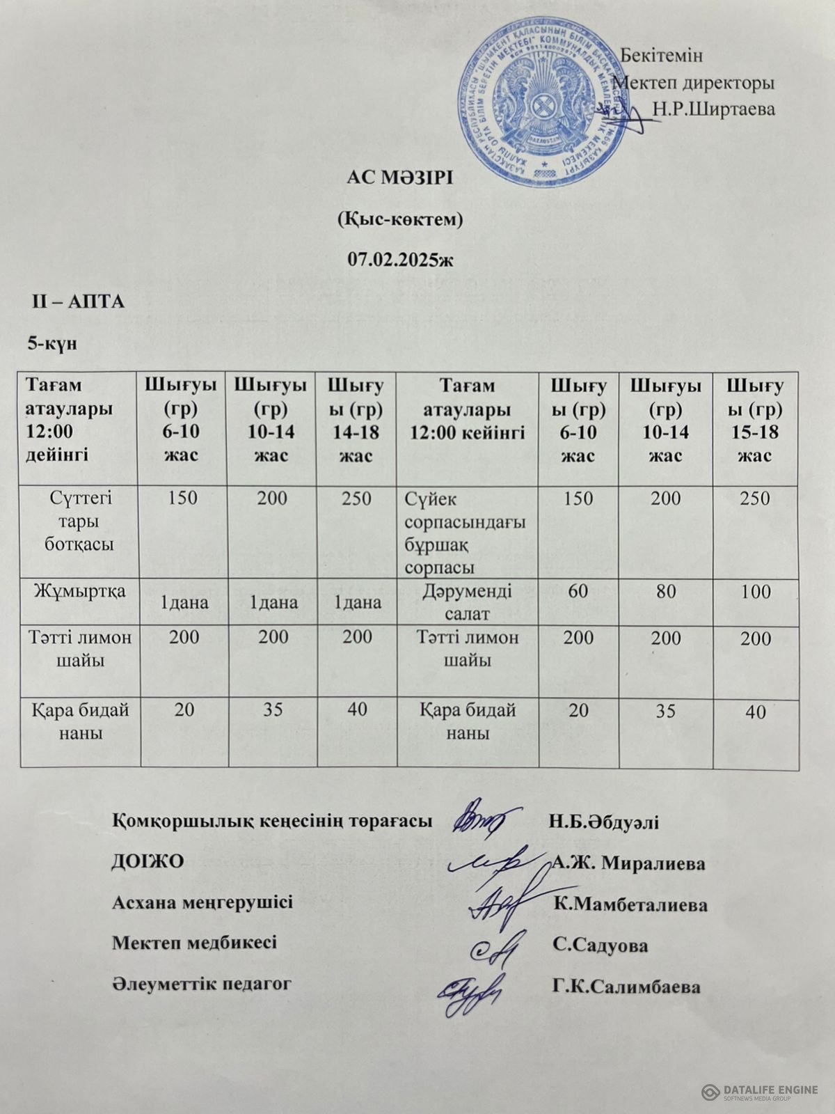 Асхана жұмысы мен күнделікті тамақтың сапасын және ас мәзірінмен сәйкестігін тексеріп , асхана тазалығына бақылау жүргізілуде. Күнделікті дайындалған тағам ас мәзірімен сәйкестендірілген. 2 апталық ас мәзірі бекітіліп , әр сыныптың тамақтану кестесі жасалынды. Тамақтану залында әр сыныптар үшін жеке үстелдер қойылған.