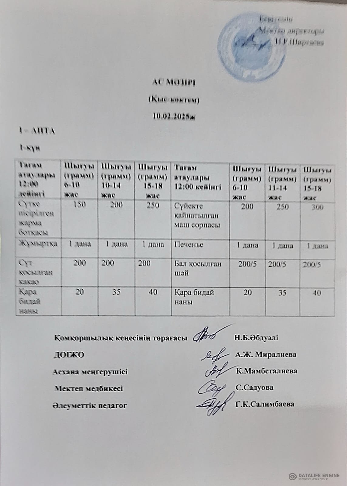 Асхана жұмысы мен күнделікті тамақтың сапасын және ас мәзірінмен сәйкестігін тексеріп , асхана тазалығына бақылау жүргізілуде. Күнделікті дайындалған тағам ас мәзірімен сәйкестендірілген. 2 апталық ас мәзірі бекітіліп , әр сыныптың тамақтану кестесі жасалынды. Тамақтану залында әр сыныптар үшін жеке үстелдер қойылған.