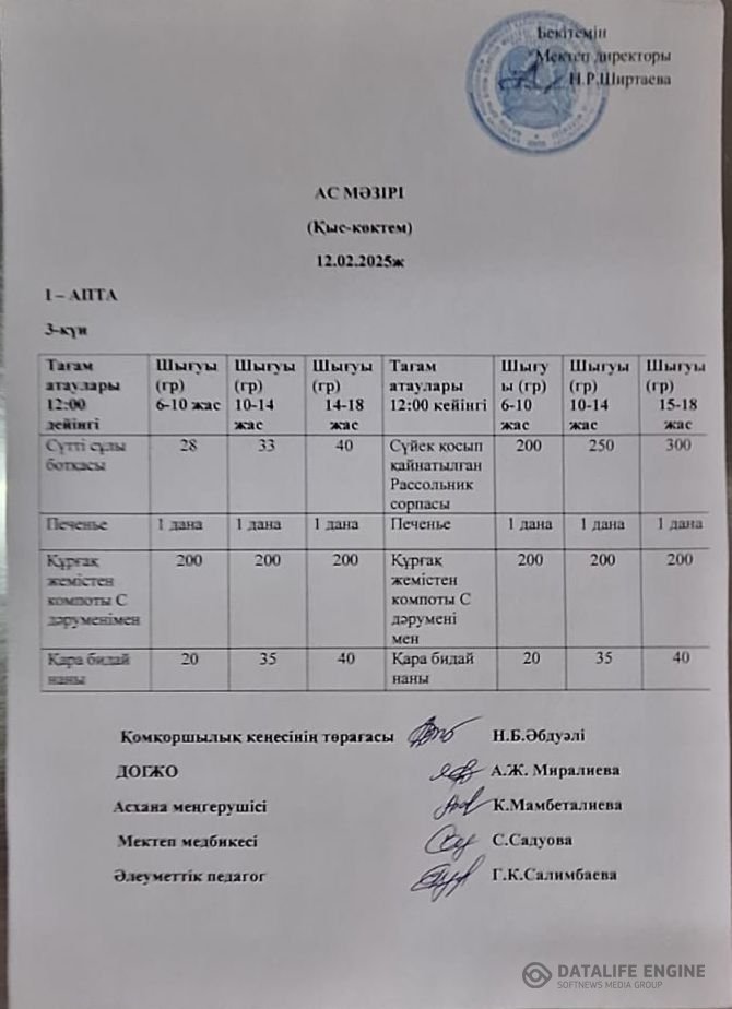 Асхана жұмысы мен күнделікті тамақтың сапасын және ас мәзірінмен сәйкестігін тексеріп , асхана тазалығына бақылау жүргізілуде. Күнделікті дайындалған тағам ас мәзірімен сәйкестендірілген. 2 апталық ас мәзірі бекітіліп , әр сыныптың тамақтану кестесі жасалынды. Тамақтану залында әр сыныптар үшін жеке үстелдер қойылған.