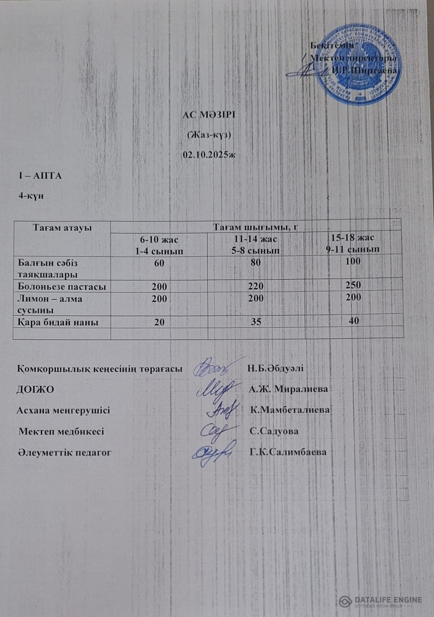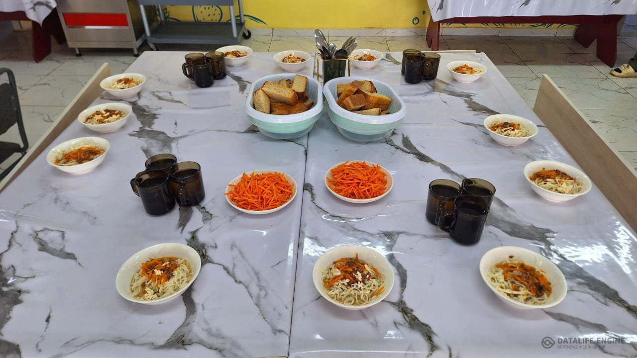Балаларға күн сайын сапалы да құнарлы ас мәзіріне сай, бір реттік ыстық тамақ өз уақытында беріледі.