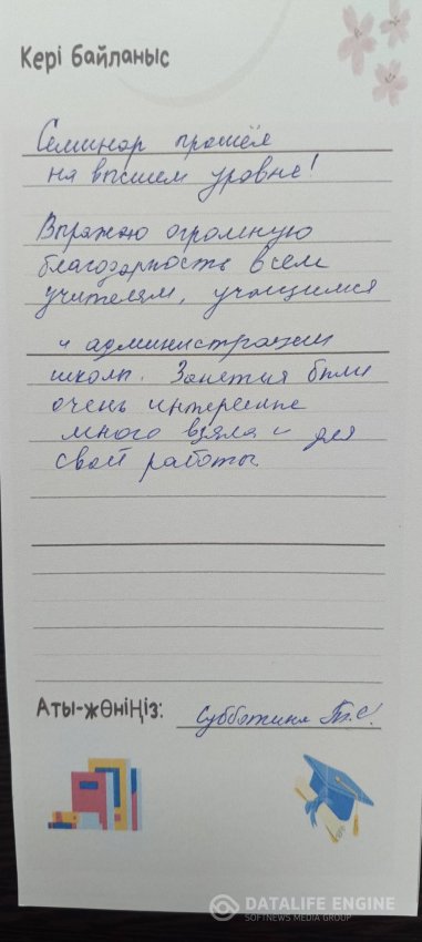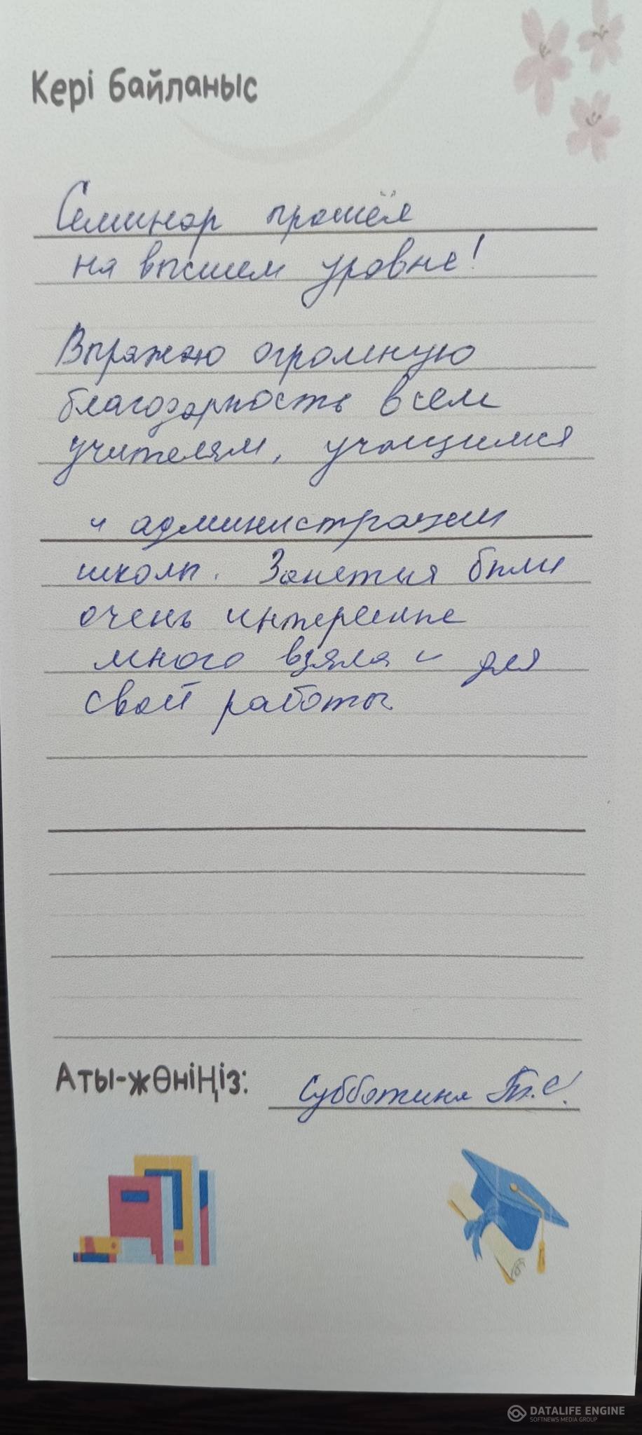 Өткізілген семинар бастауыш буын педагогтары үшін тәжірибе алмасудың, жаңашыл идеяларды бірлесіп талдаудың, құндылыққа негізделген оқытудың маңызын терең түсінудің тиімді алаңы болды.
